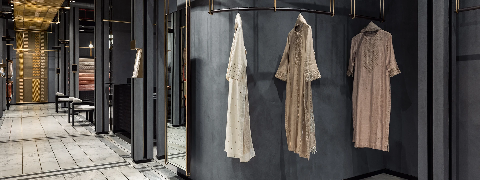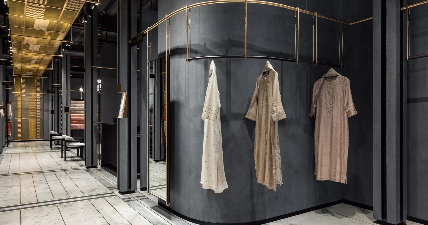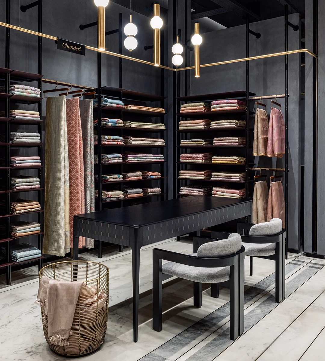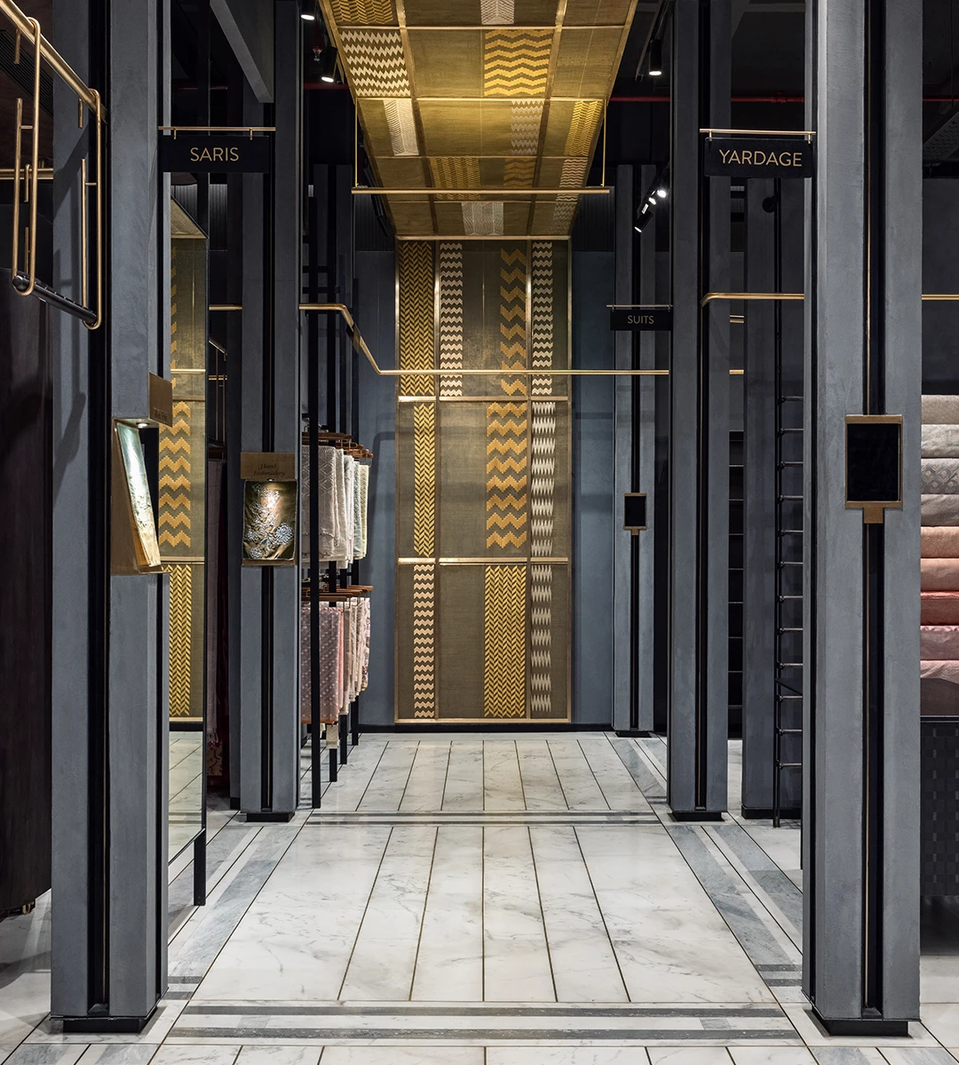 Inspired by the rhythmic arcades of historic bazaars, <rt-red>the sharp composition of a sleek, central colonnade breaks up the linear footprint. The columns mark off the distinct product segments, recreating the notion of walking down the narrow lanes of a bazaar, each segment treated as a shop in itself.<rt-red> Visually fragmenting the store’s large inventory, it also imbues the customer journey with a sense of discovery.