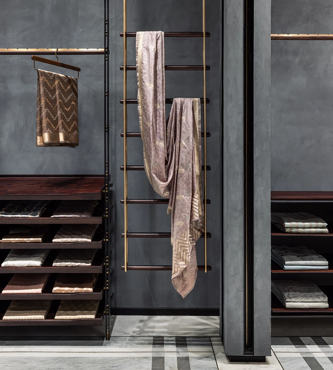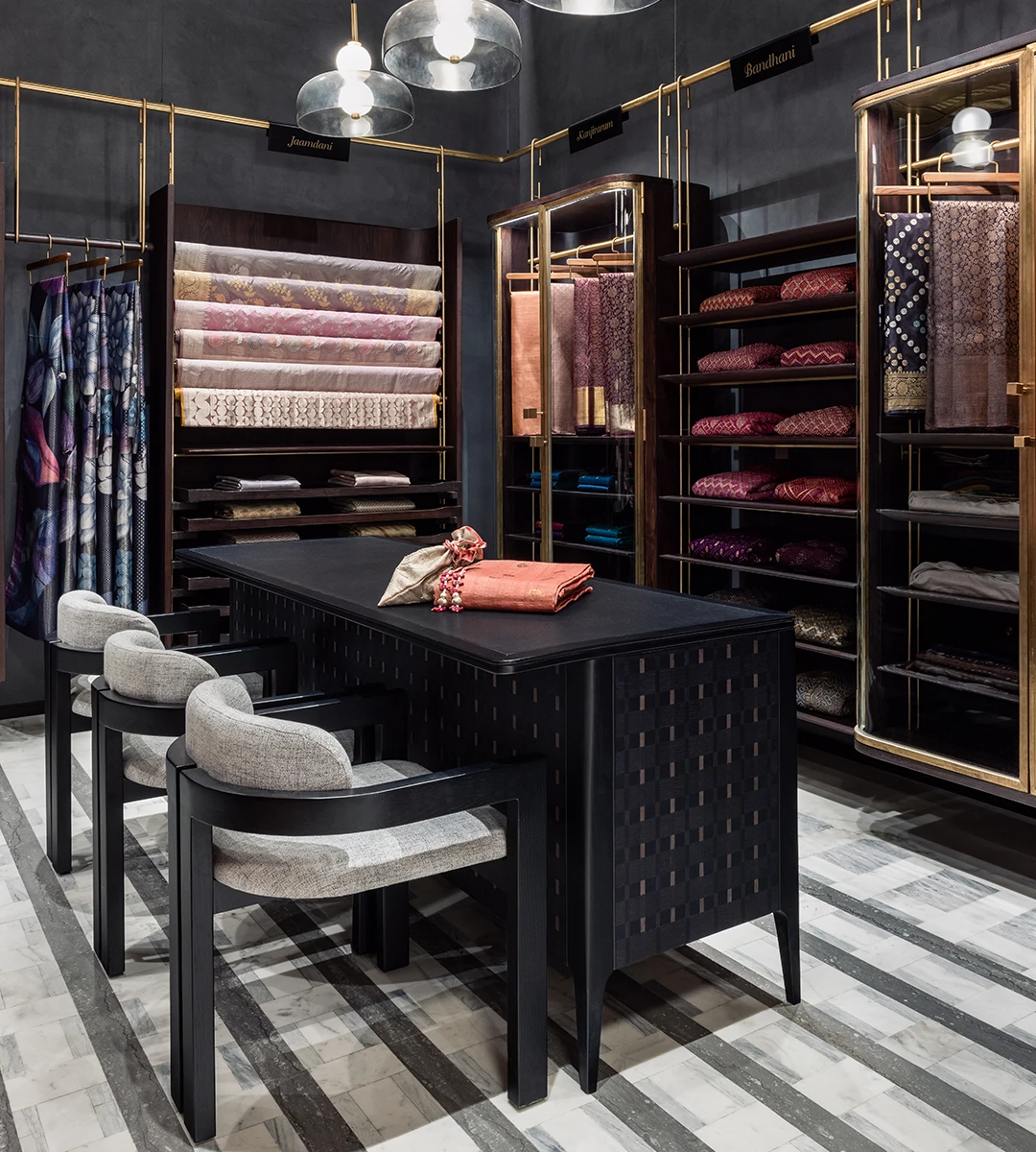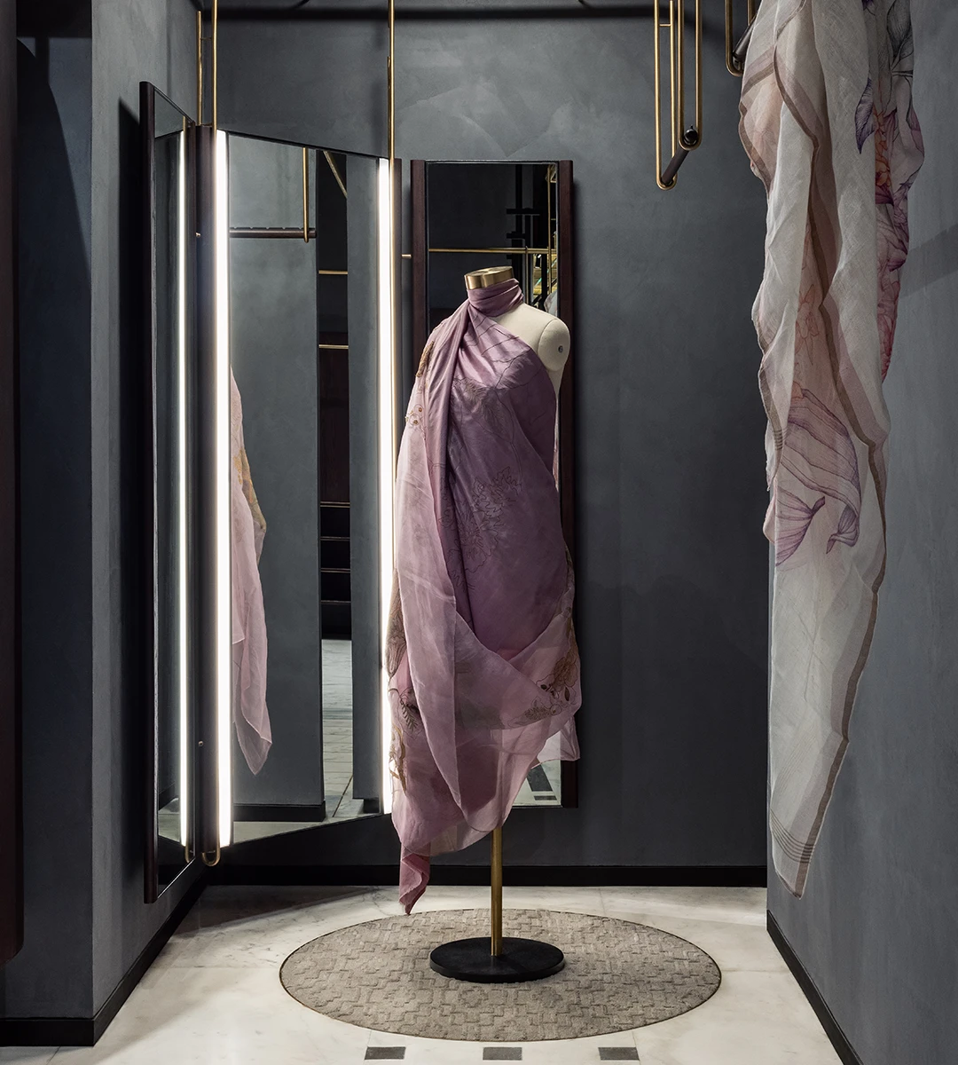 Inspired by the rhythmic arcades of historic bazaars, <rt-red>the sharp composition of a sleek, central colonnade breaks up the linear footprint. The columns mark off the distinct product segments, recreating the notion of walking down the narrow lanes of a bazaar, each segment treated as a shop in itself.<rt-red> Visually fragmenting the store’s large inventory, it also imbues the customer journey with a sense of discovery.